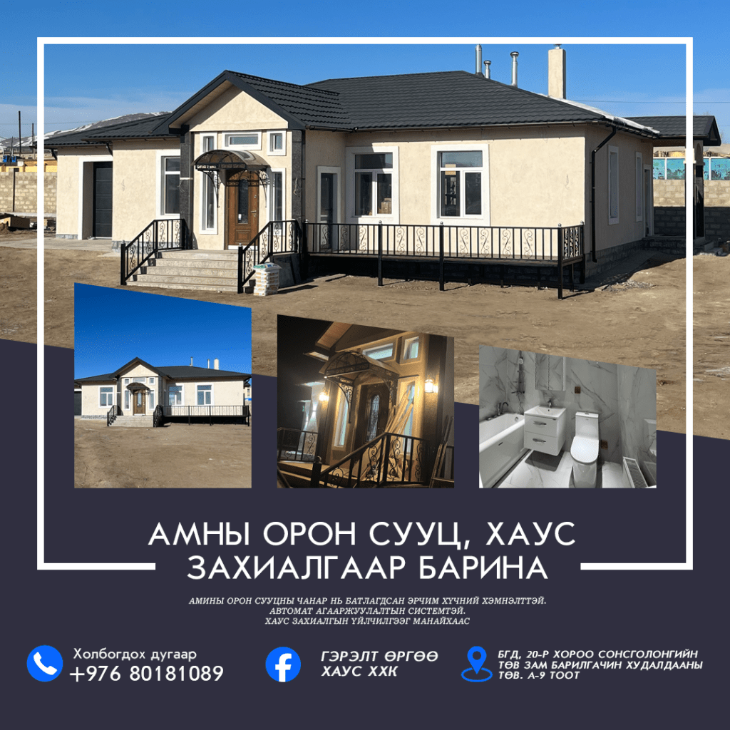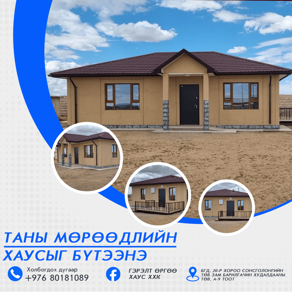 Манай компани нь Мак-ийн блок өрөгт ханын бүтээцтэй, өндөр нягттай хөөсөн фасадтай, хучилтын хавтангаар хучиж, Монгол базальтын дулаалгатай, канад технологийн ханын угсармал бүтээцтэй, мөн дээвэр нь угсармал декра төмөр, гал тогооны өрөө болон ариун цэврийн өрөөний автомат агааржуулалтын системтэй, камин зуухны яндан байршуулах боломжтой, Цонх констракшны эрчим хүчний хэмнэлттэй Low-e түрхэцтэй 3-н давхар шилтэй дулаан цонхыг санал болгодог. Гадна хаалганууд Орос улсын чанартай хүйтэнд тэсвэртэй цельсийн -55 градуст дулаанаа хадгалдаг Торекс хаалга суулгаж өгдөг. Гадна хөөсөн фасадаа Польш улсын гоёлын чулуугаар өнгөлдөг. Өнгөний өргөн сонголттой.